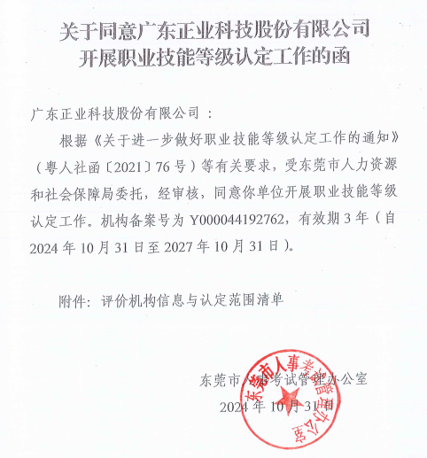 近日,廣東正業(yè)科技股份有限公司(以下簡稱:正業(yè)科技)收到了東莞市人事考試管理辦公室“關(guān)于同意廣東正業(yè)科技股份有限公司開展職業(yè)技能等級認(rèn)定工作的函”。這標(biāo)志著公司順利完成了職業(yè)技能等級認(rèn)定備案工作,開啟了公司技能人才隊(duì)伍培養(yǎng)與認(rèn)定的新篇章。
