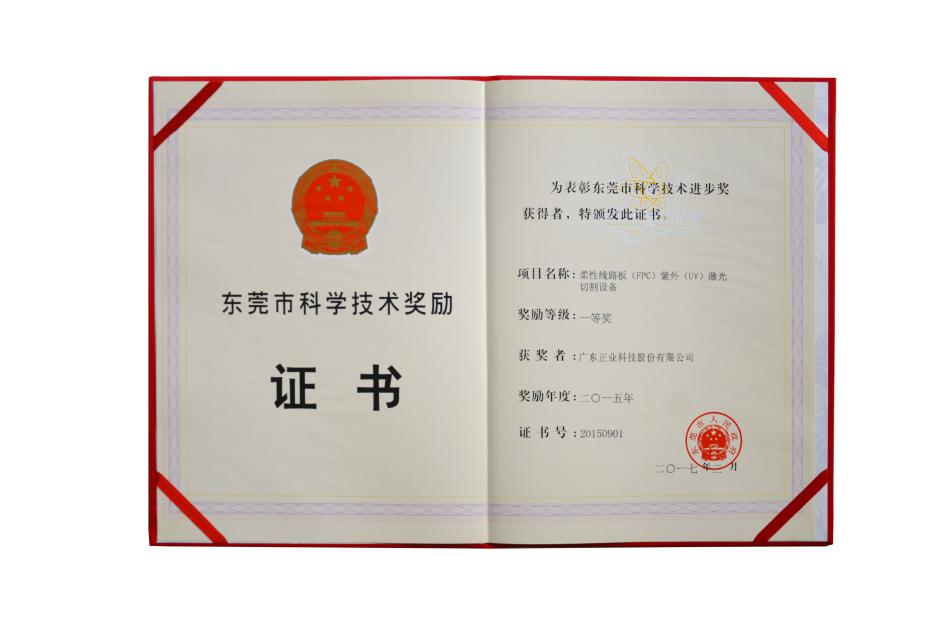 2017年3月,由東莞市政府頒發(fā),廣東正業(yè)科技股份有限公司(股票代碼:300410)榮獲東莞市科技進步一等獎,獲獎項目為“柔性線路板(FPC)紫外(UV)激光切割設備”。