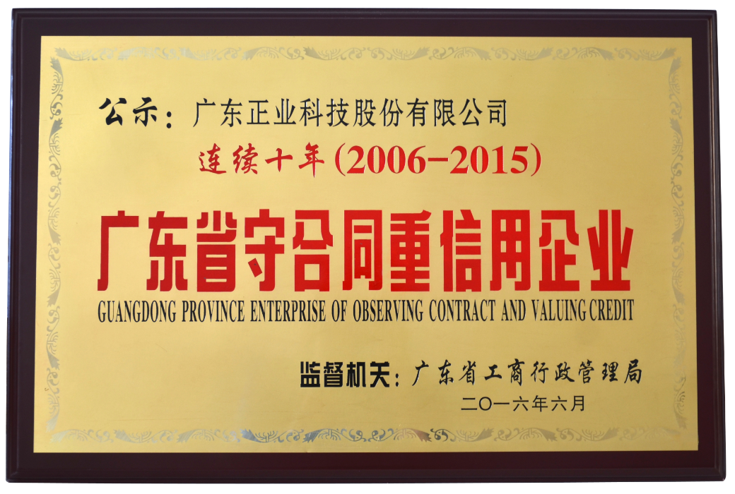 廣東正業(yè)科技股份有限公司連續(xù)十年(2006-2015)獲得“廣東省守合同重信用企業(yè)”榮譽稱號,成為業(yè)內(nèi)值得信賴的良心企業(yè)。