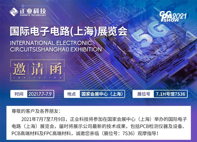 2021年7月7至7月9日,正業(yè)科技將參加在國(guó)家會(huì)展中心(上海)舉辦的國(guó)際電子電路(上海)展覽會(huì),屆時(shí)將展示公司最新的技術(shù)成果,包括PCB檢測(cè)儀器及設(shè)備、PCB高端材料及FPC高端材料,誠(chéng)邀您親臨(展位號(hào):7S36)觀(guān)摩指導(dǎo)!